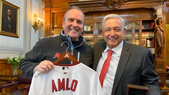 “Nos reunimos con Derrick Hall, director de los Diamondbacks de Arizona”, indicó el mandatario que en la fotografía se le ve sosteniendo un pelota conmemorativa así como un jersey con sus iniciales AMLO y el número 3.