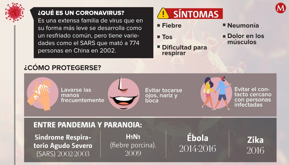 El coronavirus Covid-19 ha provocado la activación de alertas en países del mundo entero. Ha sido calificado como un misterioso virus similar al Síndrome respiratorio agudo grave (SARS), que contagió a más de 8 mil personas entre 2002 y 2004 y que ocasionó más de 700 muertes. Se cree que el nuevo coronavirus tiene su origen en la región de Wuhan, en el centro de China; en los últimos días el brote se ha propagado rápidamente por las grandes ciudades del país, además de llegar a otras naciones por medio del contagio entre humanos. Por esta razón aquí te contamos qué es el coronavirus, cuáles son sus síntomas, cómo se contagia y cómo puedes protegerte de este brote que tiene en alerta al mundo entero. Qué es el coronavirus ![]() La agencia de salud de la ONU apunta que el brote de la enfermedad en Wuhan es responsabilidad de una cepa nunca antes vista, que pertenece a una amplia familia de virus que van desde la que provoca el resfrío común hasta enfermedades respiratorias más graves como el SARS. Según Arnaud Fontanet, jefe del departamento de epidemiología del Instituto Pasteur, en París, la nueva cepa es el séptimo tipo conocido de coronavirus que los humanos pueden contraer. "Creemos que la fuente puede haber sido animales vendidos en el mercado, y de allí pasó a la población humana", dijo a la AFP.