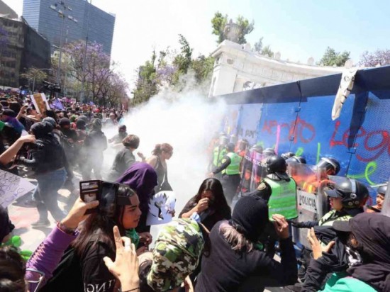 Al llegar al Zócalo, el grupo de mujeres se colocó frente al recinto, donde también tiraron las vallas que lo protegían y realizaron pintas en el piso. |