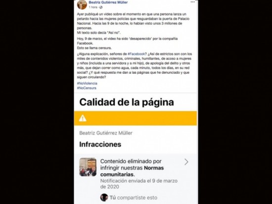 Ciudad de México.- Beatriz Gutiérrez Múller, esposa del presidente Andrés Manuel López Obrador, señaló que la red social Facebook eliminó la publicación en la que compartió el video del momento en que una manifestante lanza un petardo a Palacio Nacional.