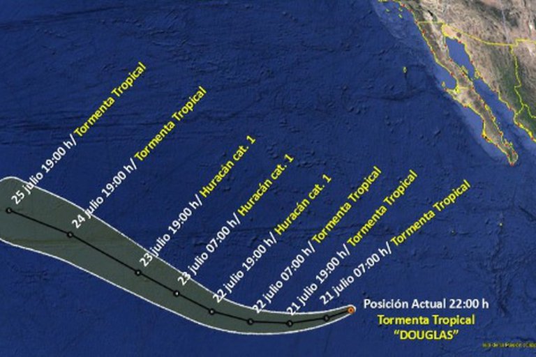 En un comunicado, el organismo de la Comisión Nacional del Agua (Conagua) aclaró que el sistema no representa un peligro para el territorio mexicano. Al momento de su formación, se encontraba a 1,645 kilómetros al suroeste de Cabo San Lázaro (BCS), y avanzaba en dirección contraria al continente, alejándose cada vez más de la costa hacia el oeste suroeste. Se trata de la cuarta tormenta tropical de la temporada, después de Amanda, Boris y Cristina, y registra vientos máximos sostenidos de 65 kilómetros por hora, con algunas rachas más fuertes de hasta 85 kilómetros por hora. Se espera que se convierta en huracán de categoría 1, en la tarde de este miércoles. Trayectoria de Douglas ![]() De acuerdo al reporte del SMN, Douglas avanza hacia el oeste suroeste a una velocidad de 17 kilómetros por hora. Con el paso de los días, se desplazará hacia el interior del Océano Pacífico distanciándose de México, y aumentando su fuerza. El miércoles 22 de julio, alrededor de las siete de la tarde, la tormenta tropical podría alcanzar vientos máximos sostenidos de 119 kilómetros por hora, convirtiéndose así en un huracán de categoría 1 en la escala Saffir-Simpson. Así se mantendría hasta el jueves 24 de julio, cuando se prevé que se debilite hasta degradarse de nuevo a tormenta tropical. Si Douglas llega a alcanzar la categoría de huracán, sería el segundo de la temporada del Pacífico en 2020, después de Cristina, que registró a principios de julio vientos que superaron los 120 kilómetros por hora, y que tampoco representó un peligro para México. Desde el SMN, monitorean además varias zonas con posibilidad de desarrollo ciclónico en los próximos días. Zonas en vigilancia por posibilidad de desarrollo ciclónico ![]() Ya los meteorólogos de distintas instituciones meteorológicas habían advertido que esta temporada 2020 sería “más activa de lo normal”. Desde Conagua informaron que en el Océano Pacífico se esperan entre 4 y 5 ciclones de categoría 1 y 2 en la escala Saffir Simpson, y entre 4 y 5 ciclones de máximo nivel, esto es, categoría 3, 4 o 5. Además, según la previsión, a esto habría que sumar entre 7 y 8 tormentas tropicales. En este momento, el SMN vigila al oeste de México una zona por el riesgo de desarrollo ciclónico. Se encuentra a 310 kilómetros al sur de Acapulco, en el estado de Guerrero, y presenta un 30% de posibilidad de convertirse en depresión tropical en los próximos cinco días. La actividad también es muy intensa en el Océano Atlántico. Allí, hay dos áreas en vigilancia. La primera de ellas se ubica al norte de Cuba y a 819 kilómetros al este-noreste de las costas e Quintana Roo. Esta zona de baja presión, asociada con una Onda Tropical, incrementó a 30% su posibilidad de desarrollo ciclónico en un plazo de entre 48 horas y 5 días. La segunda área se ubica aún muy lejos de las costas de México, en América Central, a unos 5,295 kilómetros al este-sureste de las costas de Quintana Roo. Se mueve hacia el oeste a 20 km/h e incrementó a 40% su probabilidad para desarrollo ciclónico en un plazo también de 48 horas y cinco días. En el Atlántico, la previsión de Conagua apunta a que se darán entre 3 y 4 huracanes de máxima categoría, entre 4 y 5 serían de categoría 1 y 2, y hasta 10 tormentas tropicales. |