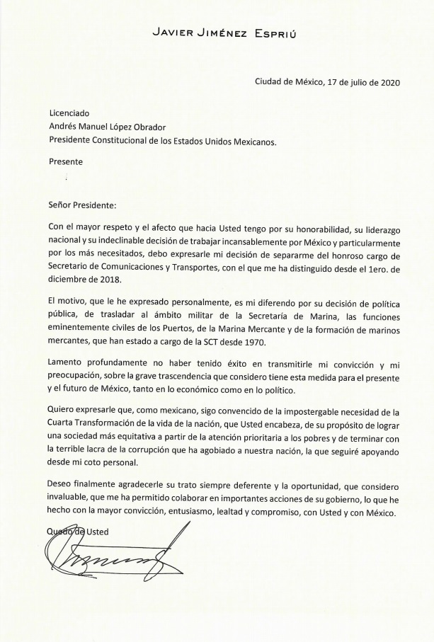 | Esto dice la carta de renuncia de Jiménez Espriú a López Obrador. | ||||||