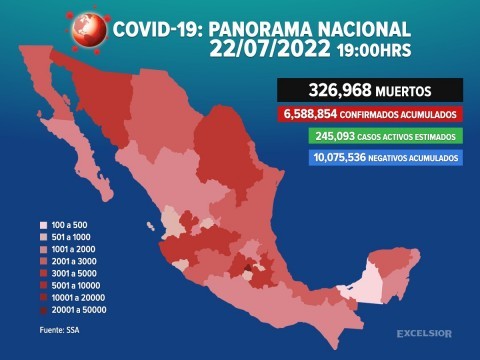 En su reporte diario, también publicado en su sitio web, se dio a conocer que las muertes relacionadas al covid-19 en la República llegaron a 326,968. En las últimas 24 horas se reportaron 89 fallecimientos relacionados al covid-19. La misma secretaría informó que son 245,093 casos activos estimados. También señaló que los casos positivos estimados serían 6,897,591; mientras que los recuperados llegaron a 5,647,636. |
