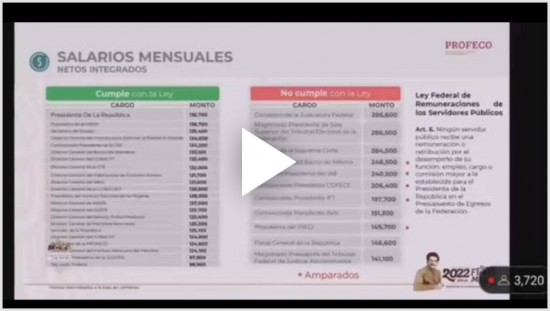 Sheffield Padilla informó que las instituciones del Poder Judicial son los que tienen sueldos por encima del presidente de México, incluso casi el doble del neto mensual, "gracias a que presentan excusas y amparos y pese a que es una disposición constitucional", enfatizó el procurador del Consumidor. Reveló que servidores públicos que ganan más que López Obrador son de al menos 11 dependencias y de órganos autónomos que están amparados para no cumplir con la Constitución y tener un sueldo mayor al del presidente López Obrador. ¿Quiénes gana más que AMLO? Por ejemplo, dijo Ricardo Sheffield, los magistrados de la Judicatura Federal, ganan el doble que el titular del Ejecutivo Federal, es decir tienen un salario mensual neto (sin impuestos) de 286 mil 600 pesos. También se reveló que Reyes Rodríguez Mondragón, magistrado presidente de la Sala Superior del Tribunal Electoral Federal, tiene un sueldo de 286 mil 500 pesos mensuales, sin impuestos o los ministros de la Suprema Corte de Justicia de la Nación (SCJN), que ganan también 284 mil 500 pesos netos al mes. La Gobernadora del Banco de México, Victoria Rodriguez Ceja, tiene un sueldo neto de 248 mil 500 pesos; también el Consejero presidente del Instituto Nacional Electoral (INE), Lorenzo Córdova Vianello, tiene un sueldo neto mensual de 204 mil 500 pesos y el titular de la Comisión Federal de Competencias Económicas (Cofece), Nery Pérez Trujillo, gana 206 mil 500 pesos netos.