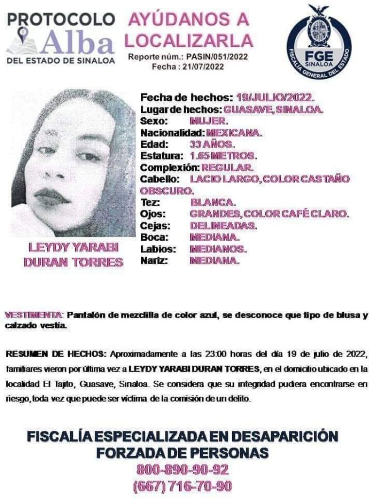 La joven mujer originaria de El Tajito, Guasave fue reportada desaparecida desde el pasado martes 19 de julio de este 2022, cuando acudió a un encuentro con su ex pareja. Familiares afirmaron que salió de casa cerca de las 11:30 de la mañana y su última conexión en su teléfono celular ocurrió cerca de las 5:50 de la tarde cuando envió un mensaje a una de sus hijas. ![]() En el texto, Leydi Yaravi advertía que las cosas no iban bien, pues su expareja “andaba muy drogado” y no sabía de lo que era capaz de hacer porque se había puesto muy violento. Ese fue su último mensaje. Familiares se organizaron para realizar la búsqueda que se prolongó durante cinco días y concluyó este domingo tras el macabro descubrimiento en las inmediaciones de Leyva Solano, Guasave, donde fueron localizadas cuatro bolsas con restos humanos. Eran los restos de Leydi Yaravi. El reporte del hallazgo se realizó la tarde de este domingo y fue gracias a tatuajes que la joven poseía como su padre logró identificarla. Tras su muerte, quedan en orfandad sus tres hijas, todas menores de edad. Leydi Yaravi es la segunda mujer asesinada en menos de una semana y la número 17 en lo que va del año en Sinaloa. |