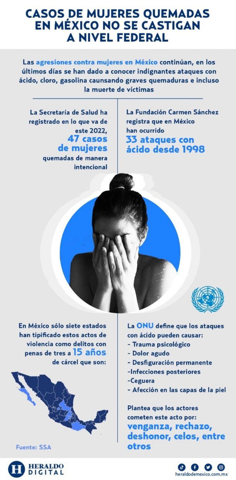 El número de asesinatos de hombres cayó, según datos del Inegi, pero la muerte de mujeres se mantuvo estable. Una cifra devastadora, que muestra la violencia hacia las mujeres en México, es la de la Secretaría de Salud federal. Tan solo en el primer semestre del 2022, unas 47 mujeres fueron quemadas con gasolina, ácido o algún solvente corrosivo de manera intencional, en promedio fueron registrados uno y dos ataques de este tipo a la semana en clínicas a lo largo de todo el país. Una cifra que debe alertar a las autoridades mexicanas es el creciente uso de ácido para dañar a mujeres. La Organización de las Naciones Unidas (ONU) lo ha catalogado como “una forma devastadora de violencia de género”. La Fundación Carmen Sánchez, ONG creada en el año 2021 por la misma Carmen Sánchez, quien es sobreviviente a un ataque con ácido en 2014 por parte de su expareja, Ximena Canseco y Victoria Snell, arropa los casos de mujeres violentadas en México con este terrible método. ¿Qué estados tipifican cómo delitos los ataques con ácido? ![]() En México cada vez aumentan más las agresiones contra mujeres utilizando sustancias como ácido, fuego, cloro industrial, alcohol, gasolina y sólo siete estados han tipificado estos actos de violencia como delitos con penas de tres a 15 años de cárcel, pues en los 25 estados no se considera un delito, por lo que las entidades donde sí se penan con cárcel estos estados son: Aguascalientes: El artículo 107 del código penal establece como delito agresiones en los genitales y glándulas mamarias ya sean por mutilación o con sustancias corrosivas con penas de tres a ocho años de prisión dependiendo de la gravedad de las lesiones y si está en peligro o no la vida de la víctima. Baja California Sur: Las lesiones contra mujeres en razón de género serán penadas con siete a catorce años de cárcel, incluye ataques con sustancias corrosivas que podrían aumentar dos tercios la sentencia al considerarse agravante usarlas. Ciudad de México: De acuerdo con el Artículo 103 del Código Penal los agresores recibirán de seis a ocho años de prisión en caso de generar la pérdida de cualquier función orgánica, una enfermedad incurable o una deformidad; la pena se duplicaría si se usaron sustancias corrosivas químicas siendo una pena de cinco a diez años de prisión y de cien a doscientos días multa. Estado de México: El Artículo 128 del Código Penal estatal establece de cinco a diez años de cárcel y de cien a doscientos días de multa “cuando las lesiones se produzcan dolosamente mediante el uso de ácidos, sustancias corrosivas, o químicas o flamables". Hidalgo: Las agresiones que no pongan en peligro la vida de la víctima van de nueve a 19 años de prisión; la pena será aumentada hasta una tercera parte si las lesiones son dolosas y se duplica si se usan sustancias químicas Oaxaca: El Código Penal estatal castiga las lesiones contra el cuerpo de una mujer por razón de género, con cualquier tipo de sustancia corrosiva química con una pena de 20 a 30 años de cárcel, además de una multa de doscientas a quinientas veces el valor diario de la unidad de medida y actualización. San Luis Potosí: Hasta 14 años de cárcel reciben quienes atenten contra una mujer por razones de género, esa pena puede aumentar dos tercios cuando se usen sustancias químicas. A nivel federal el Senado de la República aprobó reformar el Artículo 6 de Ley General de Acceso de las Mujeres a una Vida Libre de Violencia, con el objetivo de tipificar los ataques con sustancias cáusticas, irritantes, tóxicas o inflamables o cualquier otra pueda provocar lesiones como violencia física de género. Ahora la Cámara de Diputados deberá analizar y aprobar los cambios de esa reforma. María Elena Ríos, activista y sobreviviente de un ataque con ácido compartió para El Heraldo Digital que su propósito es que se estructure una ley federal donde se castigue ejemplarmente a los agresores que lastiman a las mujeres y que se convoque a las sobrevivientes de un ataque con sustancias corrosivas para que expongan las necesidades de las víctimas para tener mejor iniciativas que se "Me gustaría invitar a los legisladores a que se acerquen a platicar con las sobrevivientes para que les digamos de viva voz lo que necesitamos para poder generar mejores iniciativas que vayan ponderando una futura ley", afirmó María Elena Ríos. Sobre los recientes feminicidios que han conmocionado a México, Elena Ríos pide a las autoridades que rompan el pacto patrialcal y haya una justicia pronta y expedita. "Nosotros no somos personas que no podemos pensar, es demasiado cinismo decir que Luz Raquel se quemó sola, que Debanhi se ahogó sola... hago un llamado al estado federal, pero sobre todo a las fiscalías que nos representan que hagan su trabajo, es así de simple, no somos tontas". No hay cifras oficiales de los ataques con ácido en México La Fundación Carmen Sánchez detalla que en el país no hay cifras oficiales de los ataques con ácido hacia mujeres. Pero según sus números, los casos han aumentado en los últimos 20 años. Ellas tienen un registro de 28 ataques, colocando a la Ciudad de México, Puebla y el Estado de México como las entidades con más reportes de estos crímenes. TE PUEDE INTERESAR: Ataques con ácido en México: Tres casos que indignaron a la sociedad por la terrible violencia hacia las mujeres De las 28 víctimas mujeres, solo 22 han logrado sobrevivir. En la mayoría de los casos, las víctimas tenían entre 20 y 30 años de edad. En el 85 por ciento de los casos el autor intelectual fue un hombre: 5 de ellos eran parejas y 11 de ellos exparejas sentimentales. En el 90 por ciento de los casos, el ataque ha ido dirigido al rostro. La mayoría de los crímenes se cometieron en calle, 4 de ellos en la casa o la puerta de entrada. Más del 30 por ciento de los ataques se cometieron por dos o más personas: ya sea como actores 