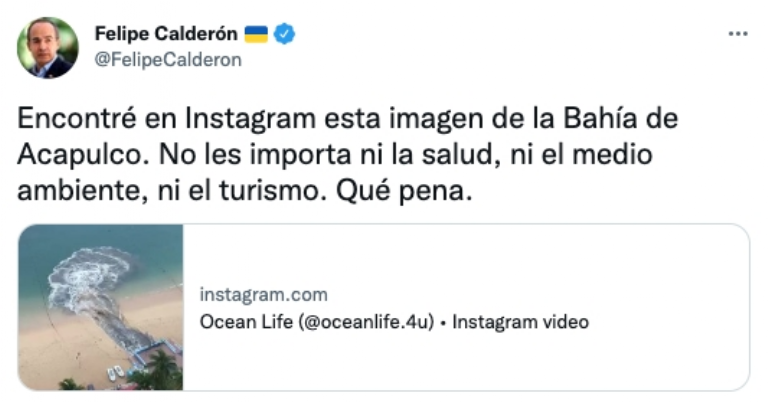 “Encontré en Instagram esta imagen de la Bahía de Acapulco. No les importa ni la salud, ni el medio ambiente, ni el turismo. Qué pena”. ![]() Al respecto, López Obrador indicó que la actuación de su homólogo de extracción panista es una "vergüenza", ya que el video donde expuso su denuncia corresponde en realidad a una situación en España, por lo que dijo, toca madera para que terminada su administración desaparezca de la vida pública política. “Miren la vergüenza de Calderón... Por eso toco madera, yo termino en dos años y me jubilo, que voy a estar yo utilizando el Face, o dando declaraciones o participando, nada más por respeto al cargo que se tuvo, haiga sido como haiga sido. Resulta que no es Acapulco, es España, pero esto es menor”, dijo AMLO. El jefe del Ejecutivo indicó que las acciones de Calderón Hinojosa son reflejo de una crisis por la que están pasando los políticos del antiguo régimen ante el proceso de transformación que encabeza con la 4T, aseguró. AMLO expone video del expresidente de Francia contra Calderón En la misma conferencia de prensa, Andrés Manuel López pidió poner un video donde el presidente de Francia, Nicolás Sarkozy declaró que su entonces homólogo Felipe Calderón, no tomaba ninguna decisión sin antes ser aprobado por el "Ministro del Interior", al respecto, López Obrador leyó la traducción de la declaración. "... el presidente Calderón no podía tomar decisiones sin el Ministro del Interior, (Genaro) García Luna", enfatizó AMLO. En ese sentido, López Obrador aseguró: "Tan vergonzoso lo que dice Sarkozy de Calderón, y si lo estoy tratando ahora es porque ojalá entre en razón (Felipe Calderón) porque eso es lo que caracteriza a los conservadores, la doble moral". Sin embargo, López Obrador afirmó que todas las manifestaciones del sector conservador hacen bien al país para mostrar la forma de pensar de la oposición que hacen todo lo posible para que el antiguo régimen siga con el control del país, y citó como ejemplo el montaje de la aprehensión de la ciudadana francesa Florence Cassez (de donde tomó la declaración del presidente francés), así como la declaración de la actriz Laura Zapata que llamó "flojos" a los mexicanos, a la que le agradeció su franqueza. “Hay que reconocerle su franqueza, porque no es nada más ella, así piensan millones, solo que ellos se atreven a decirlo”, acotó el presidente |