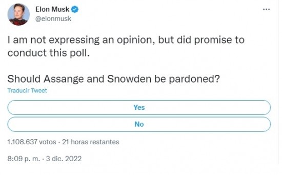 | Musk abre encuesta sobre si Assange y Snowden deben ser absueltos. | ||||||