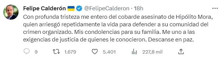 | El expresidente mexicano expresó sus condolencias por el asesinato del exlíder de los autodefensas en la localidad de La Ruana | ||||||