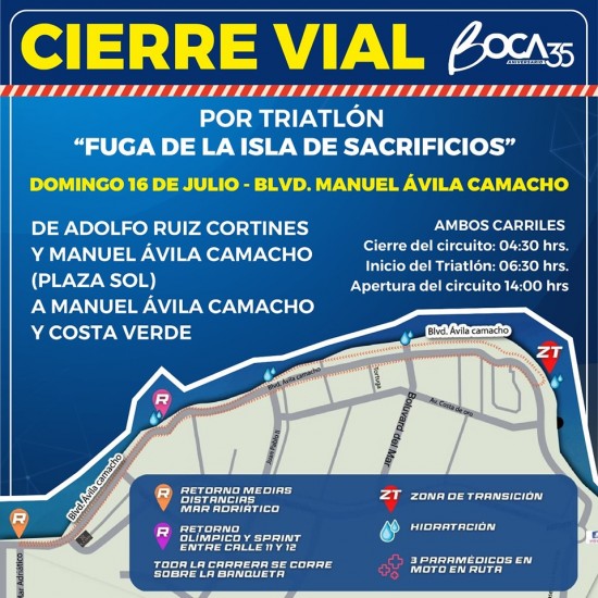 Por triatlón “Fuga de la Isla de Sacrificios”, este domingo 16 de julio se mantendrá cerrado el blvd. Manuel Álvila Camacho (ambos carriles) de Plaza Sol a Costa Verde. Cierre del circuito: 4:30 hrs. Inicio de triatlón: 6:30 hrs. Apertura de vialidad: 14:00 hrs. Te recomendamos tomar vías alternas. 🚘 #Boca35Aniversario #LoMejordeVeracruz |