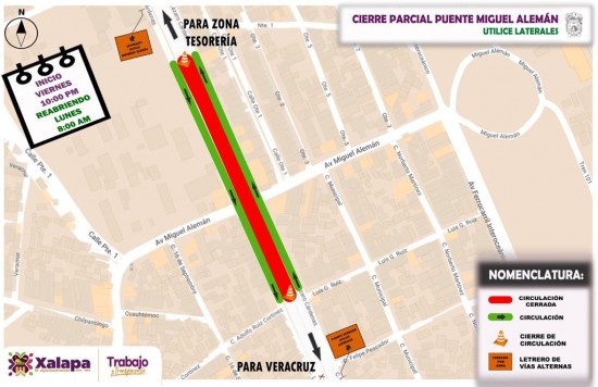 Xalapa, Ver.- Con el fin de contar con infraestructura vial de calidad, a las 22:00 horas de este viernes se inician labores de reparación sobre la carpeta asfáltica del puente Miguel Alemán, en el sentido México-Veracruz, por lo que la circulación se verá interrumpida sobre ambos carriles del puente, permaneciendo abiertas las calles laterales, informó el jefe del Departamento de Movilidad Urbana, Alfonso López Pineda.