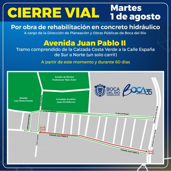A partir de hoy con duración de 60 días. Sugerimos tomar rutas alternas. #Boca35Aniversario #LoMejordeVeracruz |