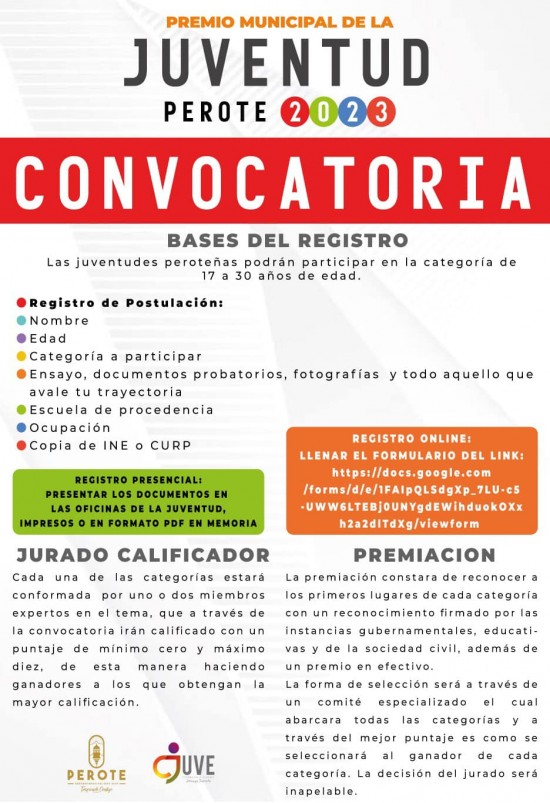 Si tienes entre 17 y 30. Años de edad y has destacado en: •Merito Académico •Expresiones Artísticas y Culturales •Inovacion en Ciencia y Tecnología •ingenio Emprendedor •Merito Deportivo •Protección al medio Ambiente •empoderamiento femenino Es tu momento de participar y ser galardonado en este evento. Fecha de premiacion 1 de Septiembre, Centro cultural peroteño, 5 pm FECHA LÍMITE: Viernes 25 de agosto |