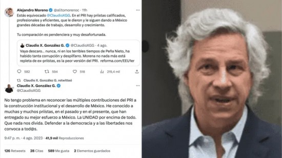 Por la mañana, el empresario señaló a través de sus redes sociales que Morena no solo está repleta de ex priistas, sino que es la peor versión del Revolucionario Institucional. Lo anterior, en alusión a la nota publicada según la cual, Rubén Hernández Fuentes y Óscar Omar Hernández Fuentes, identificados como novio y cuñado de la Gobernadora Evelyn Salgado, controlan la asignación de obras en el estado de Guerrero. Vaya descaro, nunca, ni en los terribles tiempos de Peña Nieto, ha habido tanta corrupción y despilfarro. Morena no nada más está repleta de ex-priístas, es la peor versión del PRI", señaló X. González. Alito Moreno a Claudio X: Mensaje pendenciero y desafortunado mensaje En respuesta, el dirigente nacional del PRI, Alejandro Moreno, calificó el mensaje del empresario como pendenciero y desafortunado. Moreno afirmó que en el tricolor hay militantes eficientes, que le han dado al país décadas de trabajo. Estás equivocado @ClaudioXGG. En el PRI hay priistas calificados, profesionales y eficientes, que le dieron y le siguen dando a México grandes décadas de trabajo, desarrollo y crecimiento. Tu comparación es pendenciera y muy desafortunada", señaló. Te puede interesar: AMLO reta a Claudio X. a investigar a Xóchitl El coordinador del tricolor en la Cámara de Diputados, Rubén Moreira, aseguró que el comentario del empresario fue una falta de respeto. El legislador calificó como ofensiva la comparación, por lo que le exigió una disculpa al empresario. Imprudente comentario. El #PRI es constructor de las grandes instituciones del país. Es inaceptable @ClaudioXGG lo que manifiestas. En el @PRI_Nacional nos ofenden tus comparaciones. Tus palabras son una falta de respeto. Te exijo una disculpa. Imposible el diálogo si no te retractas", escribió el priista. |