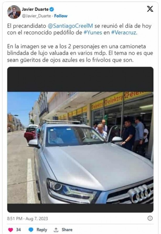 XALAPA.- Aunque cada quien habla según cómo le va en la feria, desde el Reclusorio Norte donde purga una sentencia de 9 años de cárcel tras declararse culpable de lavado de dinero y asociación delictuosa, el exgobernador Javier Duarte de Ochoa se lanzó de nueva cuenta contra el también exgobernador Miguel Ángel Yunes Linares, a quien acusó de pedófilo. A través de su cuenta de Twitter, Duarte de Ochoa publicó una fotografía en la que Yunes Linares aparece al lado del diputado federal Santiago Creel Miranda, en una de las calles del puerto de Veracruz. A través de un mensaje de tuit, el ex gobernador priista, señaló: "el precandidato @SantiagoCreelM se reunió el día de hoy con el reconocido pedófilo de #Yunes en #Veracruz". Duarte de Ochoa recordó al panista los señalamientos y denuncias que existen en su contra por el delito de pedofilia, luego de que en mayo de 2016, siendo candidato a la gubernatura por el PAN y PRD, Miguel Ángel Yunes Linares fue señalado por Edith Encalada de formar parte de una red de pederastia de finales de los 90, encabezada por el empresario Jean Succar Kuri. Incluso el diario español El País publicó las declaraciones de la mujer, quien reiteró que Miguel Ángel Yunes Linares, candidato del PAN-PRD al gobierno de Veracruz, fue cómplice de los abusos sexuales que sufrió e incurrió en las mismas prácticas vejatorias contra menores de edad. En aquel momento, organizaciones civiles acusaron al entonces candidato del PAN de tráfico de influencias para obstruir la justicia e impedir que se le procesara por pederastia. Por lo anterior, anunciaron que en ese momento reactivaron la denuncia en su contra ante la entonces PGR para que investigara al panista por sus presuntos nexos con la red encabezada por Jean Succar Kuri, quien actualmente purga una condena de 112 años de prisión por esos delitos. En aquella ocasión, Edith Encalada acusó en su declaración: "Miguel Ángel Yunes Linares era uno de los pederastas que visitaban a Succar Kuri. Lo vi entrar con una niña de siete u ocho años a una villa de Sol y Mar donde operaba esta red (en Cancún, Quintana Roo). Por eso decidí revivir este infierno, para alertar al país del peligro que implica votar por él". El señalamiento fue retomado por Duarte de Ochoa, desde su reclusión, a través de su cuenta de Twitter, donde de paso criticó que en la imagen publicada se ve a Santiago Creel y a Yunes Linares en una camioneta blindada de lujo valuada en varios millones de pesos. "El tema no es que sean güeritos de ojos azules es lo frívolos que son", publicó el ex gobernador cordobés.