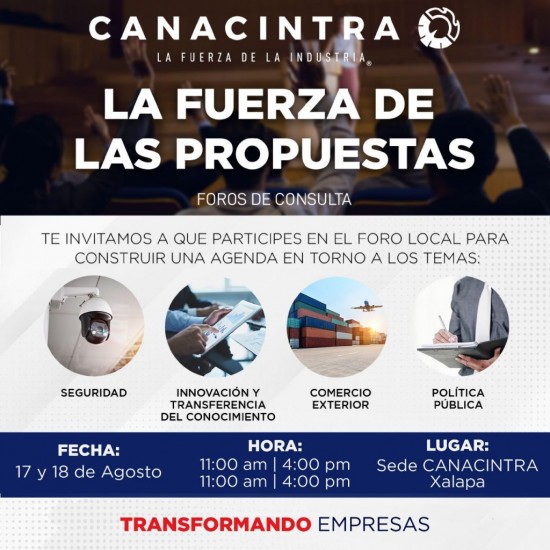 XALAPA.- Para abordar temas como el comercio exterior, la seguridad, la innovación y transferencia tecnológica, y las mismas políticas públicas, la Cámara Nacional de la Industria de Transformación (Canacintra) Delegación Xalapa anunció la realización de una serie de foros titulados 'La Fuerza de las Propuestas'. De acuerdo con el presidente de la cámara empresarial delegación Xalapa, Miguel Hernández Díaz, la intención de realizar estos foros no solo se trata de identificar problemáticas, sino de impulsar soluciones que sean prácticas y efectivas para el desarrollo del país. "El objetivo es claro, queremos que las ideas y propuestas que emerjan de estos foros se conviertan en políticas públicas sólidas, y que eventualmente sirvan de base para programas gubernamentales y legislaciones que atiendan, de manera efectiva, las necesidades del sector industrial". Por lo anterior, el dirigente empresarial afirmó que, en el marco del proceso electoral del 2024, Canacintra Xalapa se compromete a entregar esta plataforma a futuros candidatos de todos los niveles de gobierno, esperando que las ideas generadas sean consideradas y adoptadas como parte de sus agendas políticas. Hernández Díaz refirió que la iniciativa nació con la intención de diseñar y consolidar una plataforma que permita la propuesta y el análisis de políticas públicas surgidas directamente del corazón del sector empresarial e industrial. "Es de vital importancia para Canacintra que la voz del sector tenga un eco en la configuración de las agendas gubernamentales". Por ello, indicó, se han extendido invitaciones a empresarios, líderes industriales, académicos y representantes de diversos niveles de gobierno "para que, juntos, se pueda enriquecer y fortalecer el diálogo en áreas tan cruciales como el comercio exterior, la seguridad, la innovación y transferencia tecnológica, y las mismas políticas públicas". Refirió que los foros 'La Fuerza de las Propuestas' se realizarán en la sede de Canacintra Xalapa, los próximos 17 y 18 de agosto a las 11:00 horas. Así las cosas.