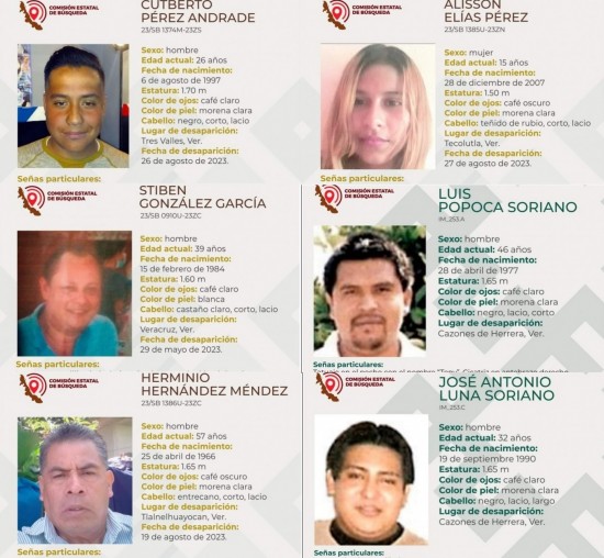 XALAPA.- La Comisión Estatal de Búsqueda de Veracruz (CEB) reportó la desaparición de seis personas en las últimas horas en diversos municipios de Veracruz y solicitó el apoyo de la población para su localización. La ficha 23/SB 1385U-23ZN reportó la desaparición de Alisson Elías Pérez, de 15 años de edad, con quien se perdió contacto el 27 de agosto de 2023 en Tecolutla. La ficha 23/SB 1374M-23ZS reportó la desaparición de Cutberto Pérez Andrade, de 26 años de edad, con quien se perdió contacto el pasado 26 de agosto de 2023 en Tres Valles. La ficha 23/SB 0910U-23ZC reportó la desaparición de Stiben González García, de 39 años de edad, con quien se perdió contacto el 29 de mayo de 2023 en el puerto de Veracruz. La ficha 23/SB 1386U-23ZC reportó la desaparición de Herminio Hernández Méndez, de 57 años de edad, con quien se perdió contacto el 19 de agosto de 2023 en Tlalnelhuayocan. La ficha IM_253.A reportó la desaparición de Luis Popoca Soriano, de 46 años de edad, con quien se perdió contacto en 2011 en Cazones de Herrera. Finalmente, la ficha IM-253.C reportó la desaparición de José Antonio Luna Soriano, de 32 años de edad, con quien se perdió contacto en 2011 en Cazones de Herrera.
