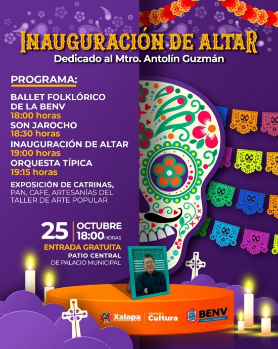 La memoria del maestro Antolín Guzmán Salazar, destacado promotor de la música jarocha y fundador de coros y grupos artísticos como la Escuela de Iniciación Musical “Juventino Rosas”, y de danza en distintas primarias del estado y la Benemérita Escuela Normal Veracruzana (BENV), será recordada por el Ayuntamiento, que este año le dedicará su Altar de Muertos. Su ofrenda será inaugurada el próximo miércoles 25 de octubre a las 18:00 horas en los bajos del Palacio Municipal, evento que contará con un espectáculo del Ballet Folclórico de la BENV, son jarocho y la Orquesta de Música Típica, así como una exposición de catrinas, pan, café y artesanías del Taller de Arte Popular (TAP). En 1970, Guzmán Salazar creó la Orquesta Típica Infantil, que se ha presentado en Los Pinos, el Palacio de Bellas Artes y escenarios internacionales en Barcelona y La Habana, ofreciendo su espectáculo ante personalidades de renombre, como la Reina Isabel II. El lunes 23 de octubre, a las 19:00 horas en el Teatro J.J. Herrera, Hugo Salcedo presentará su obra “Cocinar con el corazón”. En el “Movie martes” de este 24 de octubre se proyectará la película “El amanecer de los muertos" (EEUU 2004), del director Zack Snyder, a las 18:00 horas en el Teatro J.J. Herrera; a las 19:00 horas en el Centro Recreativo Xalapeño (CRX), se exhibirá el filme “Mûpã”, del director David Herrera, como parte del Ciclo de Cine “Doctubre”; y a la misma hora, pero en el lobby de la Iniciativa Municipal de Arte y Cultura (IMAC), se inaugurará un Altar de Muertos con la participación de la Orquesta Pauta Nueva y el Ballet Folklórico Aztlán. El 25 de octubre, la Secretaría de Gobierno de Veracruz (Segob), inaugurará la exposición de Cráneos Decorados y Catrinas Monumentales a las 9:00 horas en la plaza Lerdo, y en el mismo horario, pero en el Barrio Mágico de Xallitic, se desarrollará el “Mercado Ecológico Verde”; a las 11:00 horas los alumnos del Telebachillerato de Veracruz (Tebaev) y la Orquesta Pauta Nueva realizarán su “Xantolo en el TAP”. También, a las 18:00 horas en el CRX, Cultura Danzón ofrecerá la conferencia "Hablemos de Danzón Sesión 3”, y dentro del Ciclo de Cine Ofrenda y Memorias, se proyectará el largometraje “Macario”. A las 19:00 horas en el Teatro J.J. Herrera, el Espacio de Formación de Danzas Afro presentará su espectáculo “Mujer Tierra”, y en paralelo, la Orquesta Municipal de Xalapa y el Ballet Infantil de la ESAV estarán en el auditorio de la IMAC. El jueves 26 de octubre a las 9:00 horas en el parque Benito Juárez se expondrán los “Altares de Vida”; a las 17:00 horas, las “Tardes de Xallitic” contarán con la participación de Salsa Cumbiando y el Dueto de Enrique y Rafa; a las 19:00 horas en el CRX, Doctubre presentará “Toshkua” (2022), del director Ludovic Bonleux. El viernes 27 de octubre a las 16:00 horas en el Museo de la Música Veracruzana, Nora Lanzieri inaugurará su exposición “Las catrinas están de ronda”; a las 17:00 horas en el CRX, se inaugurará el altar de muertos a la Dra. Ernestina Quijano Gamboa; a las 18:00 horas en el Teatro J.J. Herrera, se presentará la obra “Calaveritas, brujas y café”; a las 19:00 horas, Eduardo Robledo Romero inaugurará la exposición “Cuando la vida nos alcance”; y a las 19:30 horas en el auditorio de la IMAC, se realizará el Concierto “Por mi raza”. Del 27 de octubre al 2 de noviembre, se llevará a cabo el Festival Escénico de Vivos y Muertos “Tzompantli”; los días 27, 28 y 29 de octubre, Iván Valdés, el cuentero cordobés realizará un recorrido por el “Cementerio de Leyendas”; y del 27 de octubre al 5 de noviembre, en el auditorio de la IMAC, se desarrollará el “Sótano del Terror”. El sábado 28 de octubre a las 17:00 horas en el Museo Casa de Xalapa, "A piacere Ensamble” ofrecerá el recital “Reflexiones sonoras veracruzanas”; a las 18:00 horas en el CRX, la Academia Jazzcat presentará el “80’s Concierto de Canto”; a las 19:00 horas en el Teatro J.J. Herrera, Primer Circuito Escénico realizará “Hilvanadas con danza”. El sábado y domingo a las 13:00 y 11:00 horas, respectivamente, Miguel Martínez presentará “Viene la muerte cantando”; y estos mismos días en el Barrio Mágico de Xallitic, se llevará a cabo la Novena Edición del Festival Noche de Catrinas. El domingo 29 de octubre a las 13:00 horas en el auditorio de la IMAC, el Ballet Folklórico Aztlán presentará “Tanta Danza”; y este día y el 31 de octubre a las 19:30 horas en el CRX y el 30 a las 20:00 horas en la Casa del Lago, el Teatro Comunitario actuará la obra “Macario, el regalo de la muerte”. Asimismo, a las 18:00 horas por la avenida Circuito Presidentes habrá un “Paseo de Catrinas” y a las 20:00 horas en el Barrio Mágico de Xallitic, la Orquesta Municipal de Xalapa y el Ballet Folclórico de la ESAV estarán “Cantando a los muertos”. Como parte del programa “Domingos Familiares”, a las 12:00 horas en el Patio Central del Palacio Municipal habrá show de payasitos, fomento a la lectura con mercado de hojas y el Festival Internacional Son, Ritmo y Folclor; también, a las 17:00 horas habrá “Danzón pal’ corazón”. Asimismo, a las 18:00 y 20:00 horas en el Teatro J.J. Herrera, Miguel Ángel Carrillo llevará a cabo la edición 2023 del “Cementerio Clown”. El lunes 30 de octubre a las 17:00 horas en el CRX, Pedro Jiménez Lara ofrecerá la conferencia “Dejar de respirar para morir, evolución de una tradición”; y el 31 de octubre arrancará la “Ruta fantasmal” en el Panteón Xalapeño, así como la Muestra de Altares en el Barrio Mágico de Xallitic a las 10:00 horas; el 24, se desarrollará el Festival Cultural Mictlán a las 18:30 horas. Más información y detalles de todos los eventos se pueden consultar en la página de Facebook Cultura Xalapa. |