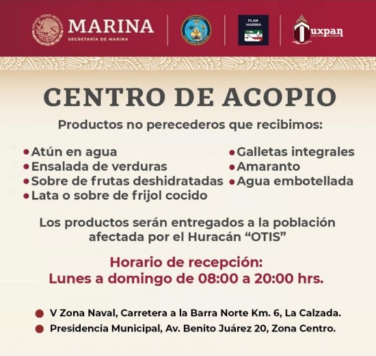 | La V Zona Naval y el Gobierno de Tuxpan instalarán centros de acopio para apoyar a damnificados del huracán 'Otis', en Guerrero. | ||||||