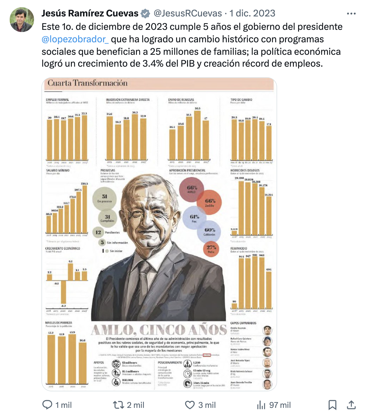 Entre las promesas estuvo “hacer realidad el derecho a la salud”, sin embargo durante su mandato se ha padecido por el desabasto de medicinas, el porcentaje de población con carencias en el acceso a servicios de salud pasó de 16.2% en 2018 a 39.1% en 2022, como lo documentó Coneval, y México fue uno de los países con más muertes durante la pandemia. Otro compromiso fue “no aumentar la deuda”, y para 2024 solicitó un nivel récord, equivalente a 5.4% del PIB. “No habrá espionaje a opositores ni a ciudadanos” fue otro de los compromisos, pero distintas investigaciones comprobaron que el Ejército siguió utilizando el software Pegasus y se han documentado al menos 10 casos de espionaje durante el actual gobierno. En cuanto a la promesa de “respetar la libertad de expresión”, la realidad es que durante todo su sexenio López Obrador lanzó ataques contra la prensa crítica, e incluso creó una sección llamada Quién es Quién en las Mentiras de supuesta verificación de informadores, aunque en ella también se ha hostigado a periodistas, además de desinformar en varios casos a favor del gobierno. “La Fiscalía General contará con absoluta autonomía”, prometió el presidente, pero en distintas ocasiones ha revelado en su conferencia matutina que él mismo ha guiado investigaciones como la de Ayotzinapa, caso en el que ha tenido una postura de defensa del Ejército. Uno más de los compromisos fue transparentar bienes de familiares cercanos a los funcionarios públicos, y aunque distintas investigaciones periodísticas como las de Mexicanos contra la Corrupción y la Impunidad han señalado presuntos conflictos de interés u otras acciones irregulares que involucran a hijos del presidente, hasta ahora no se han dado a conocer sus bienes. En la lista también se incluyó la promesa de no usar el presupuesto público para favorecer a candidatos, aunque en ese sentido el propio mandatario ha utilizado en varias ocasiones la conferencia mañanera para respaldar a aspirantes de Morena y criticar a partidos de oposición, por lo que autoridades electorales ya lo han sancionado en al menos 13 ocasiones por su intromisión en el proceso electoral 2024. Tampoco se cumplió su compromiso de que en solo tres años las refinerías nacionales por sí solas produjeran toda la gasolina que requiere el país, ni el de no permitir ningún proyecto comercial o turístico que afectara al medio ambiente, pues si bien el gobierno defiende los beneficios del Tren Maya para el sureste y las labores de mitigación, dicha obra tuvo un impacto ambiental con la tala de millones de árboles y otras afectaciones denunciadas por organizaciones ecologistas. En cuanto a los dos compromisos que sí reconoce López Obrador como pendientes, están el de descentralizar las oficinas de gobierno, y conocer la verdad sobre el caso Ayotzinapa. Aunque en una conferencia previa, en junio de 2022, dijo que solo tenía un compromiso por cumplir, y una contradicción más es que el 1 de diciembre de 2023 el vocero del gobierno federal, Jesús Ramírez, publicó un gráfico en el que se lee que había un avance de apenas 31% de promesas cumplidas, y 51 en proceso. Por: Arturo Daen @ |