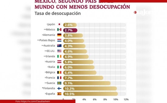 En el comparativo de Sheinbaum se incluyen otros países con mayor desocupación que México: Holanda, 4 por ciento; Australia, 4,3; Francia, 7.7 por ciento y España 10.5 por ciento, entre otros.
