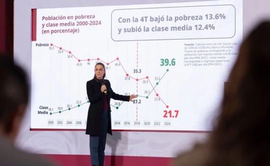 “Se llama cuarta transformación, gobierno humanista, economía moral, programas de bienestar; no programas asistencialistas, sino derechos”. Manifestó que se construye “una nueva política nacional de bienestar, derechos”. Citó que de 2022 a 2024 “prácticamente se duplicó la pensión adulta o mayor, de 3 mil 850 a 6 mil pesos por persona”. Y en cuanto al salario mínimo, subrayó que paso de 197 pesos en 2022 a 260 pesos, dos años después. “Eso es por el bien de todos primero los pobres. Eso es en esencia la transformación del país. Hoy hay en México más familias que se reconocen como clase media, es decir, que salieron de la pobreza. De acuerdo con el Banco Mundial, más porcentaje de familias están en clase media que personas en pobreza. El objetivo es que siga la tendencia y siga la transformación”, subrayó. La mandataria destacó en su mañanera que México es el país de América Latina donde más aumentó la clase media”, en tanto que en Argentina, Perú y Uruguay disminuyó. Recordó que “en 2000, después de tres sexenios de neoliberalismo, a la entrada de siglo XXI, la clase media en México representaba -de acuerdo con datos del Banco Mundial- 18.1 por ciento de la población y las personas con pobreza, 51.1 por ciento”. Queremos que haya menos personas en pobreza, afirmó, pero “hay más gente que tiene las principales necesidades resueltas, ya no hay vulnerabilidad, como le llama el Inegi”. Indicó que en enero informará sobre los aumentos que tendrán los programas de bienestar, de acuerdo con la inflación, así como de su ampliación. “Vamos a pasar de 845 mil millones de pesos a un billón, de distribución directa a las y los mexicanos como derechos. Esto tiene que ver con el aumento de los programas, los esquemas que hicimos este año, Pensión Mujeres Bienestar, Beca Rita Cetina y Salud Casa por Casa. “Es un aumento muy significativo, son más de 150 mil millones de pesos de aumento entre 2025 y 2026, directo a la gente, a través del Banco de Bienestar”. Además, en 2026 aumentará el salario mínimo y “obviamente va a impactar en reducción de la pobreza, mejora del bienestar y la calidad de vida de las y los mexicanos”. Indicó que en enero también informará sobre lo que destinarán a inversión pública y mixta, siempre garantizando la propiedad de la nación y su desarrollo sustentable, garantizando la honestidad”. Estamos seguros, añadió la mandataria, “que la tendencia va a seguir, porque es el mismo modelo económico, con mejoras todavía, por eso le llamamos el segundo piso de la cuarta transformación”. Se trata, insistió, “de prosperidad compartida, porque puede haber crecimiento económico, pero si esa generación de riqueza solo queda en unos poquitos, no hay distribución y no le toca al que menos tiene, por eso es por el bien de todos… “. |